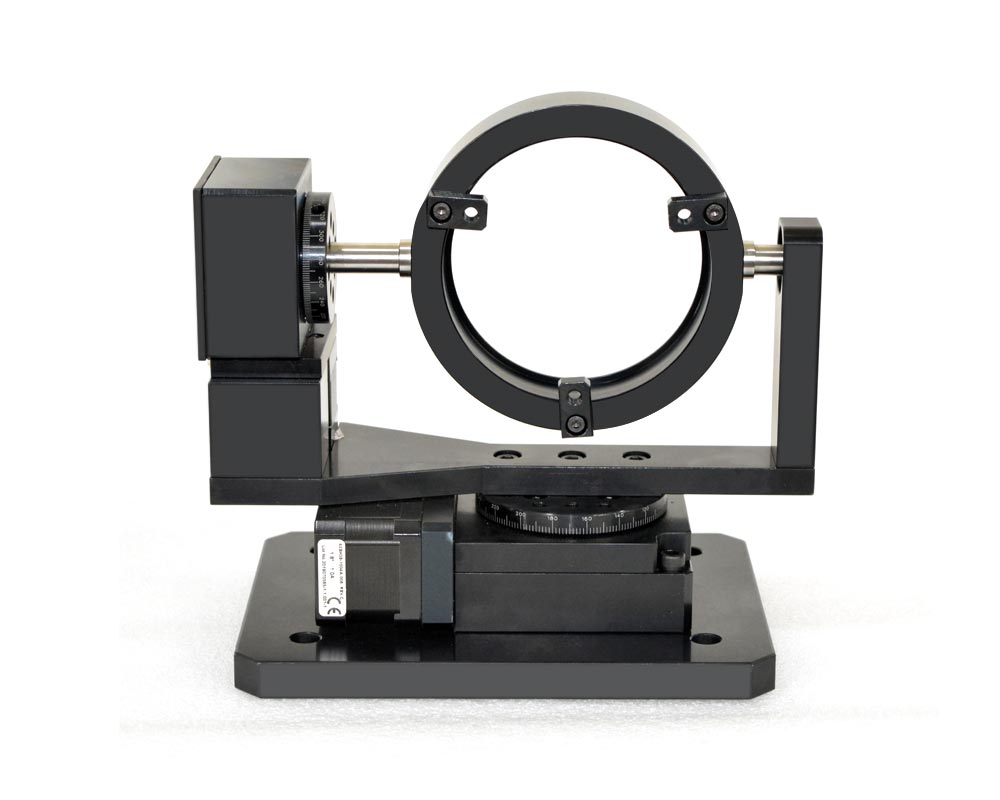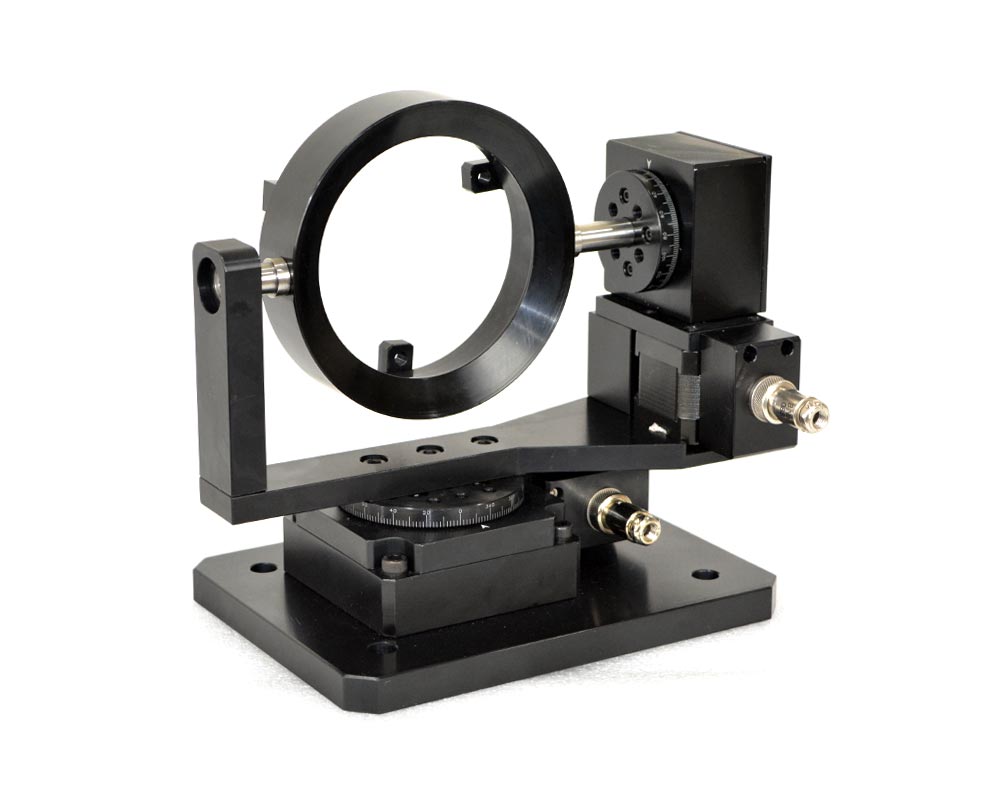 Gimbal mounts with stepper motor drives are suitable for remote positioning of the mirror in pitch and yaw directions. Suitable controller with hand held user interface is also available from Holmarc. Knob which is directly attached to motor shaft is provided for manual positioning of the mirror when ever required. These mounts are available for mirrors upto the size of 200 mm diameter as standard product. Holmarc can make these gimbal mounts for larger mirrors as well (up to 500 mm diameter). Please contact our application engineers for assistance.