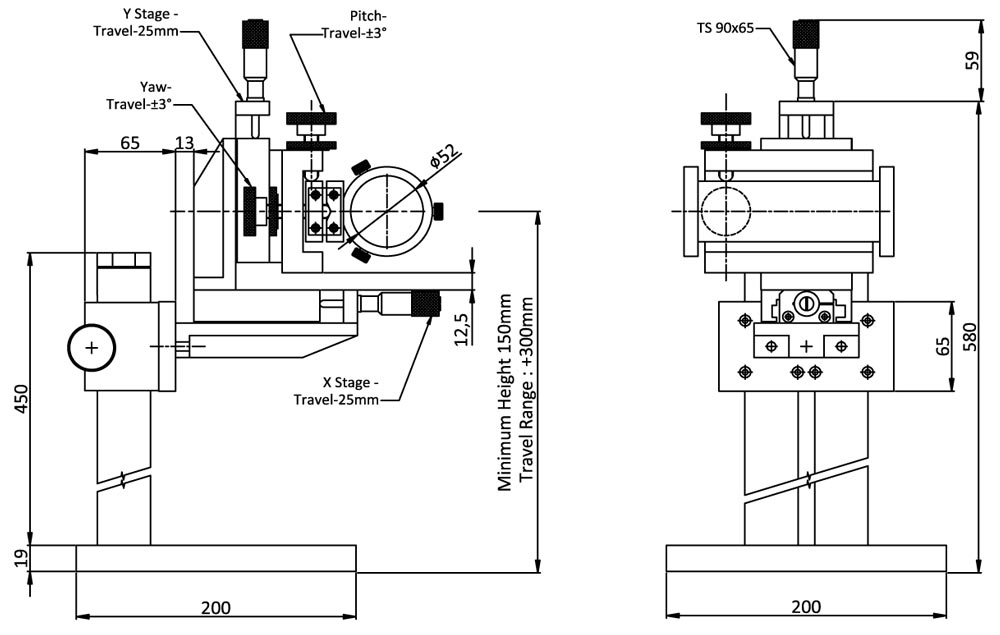 This laser mount is fixed to a pillar system so that the entire laser assembly can be positioned anywhere on the pillars. Linear adjustments along X and Z axis are provided by micrometer driven translation stages. Tilt control is given by a thumb screw.