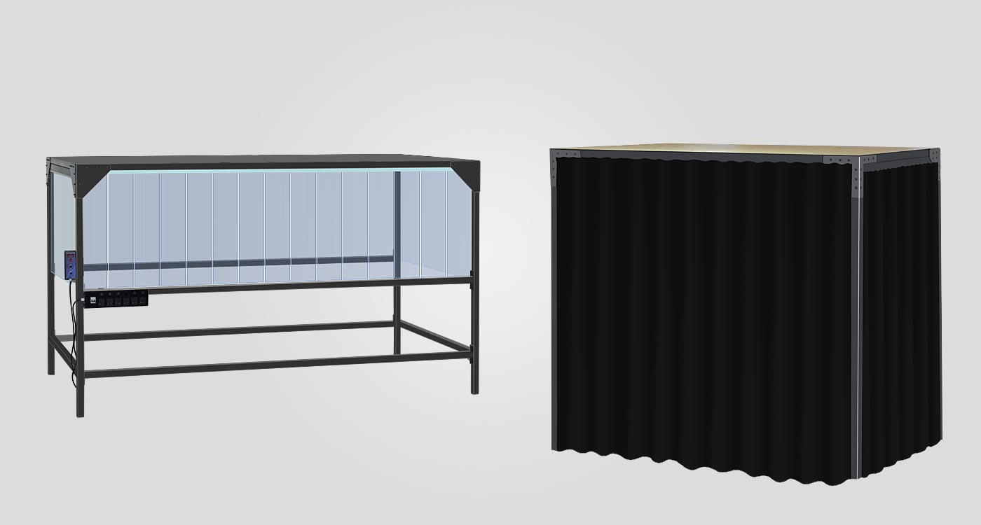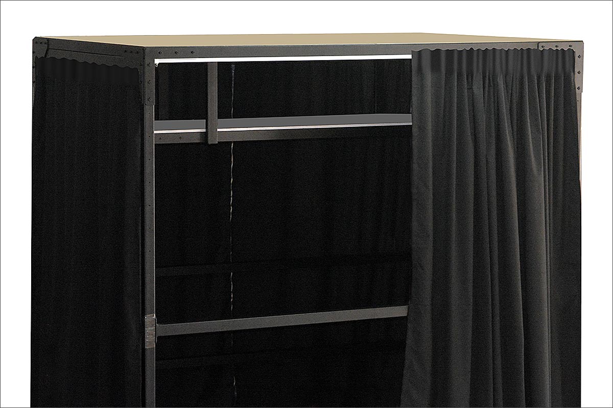 Freestanding frame with transparent curtain and internal shelf