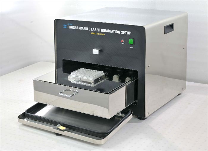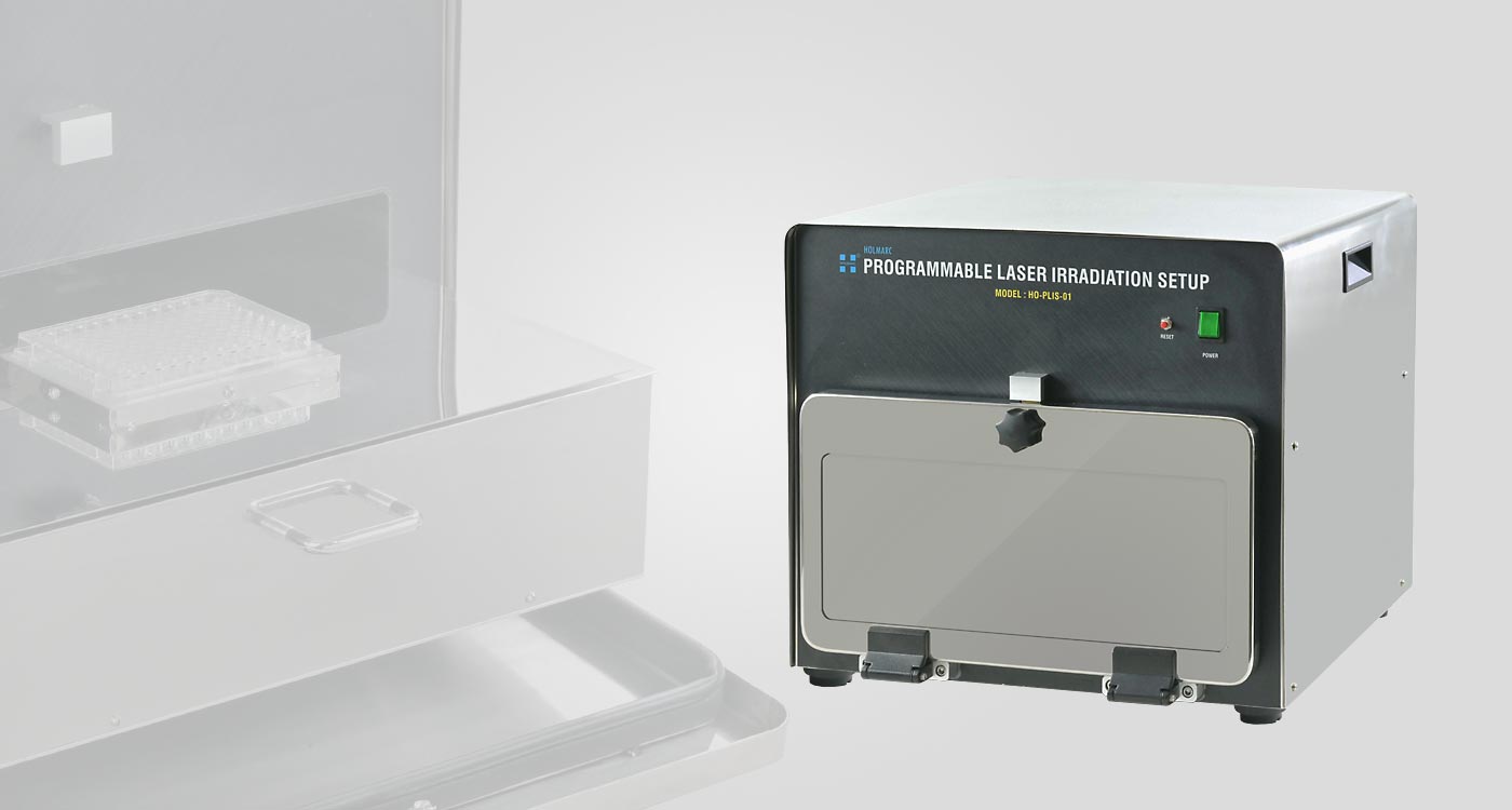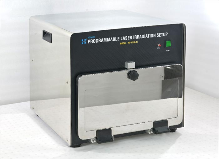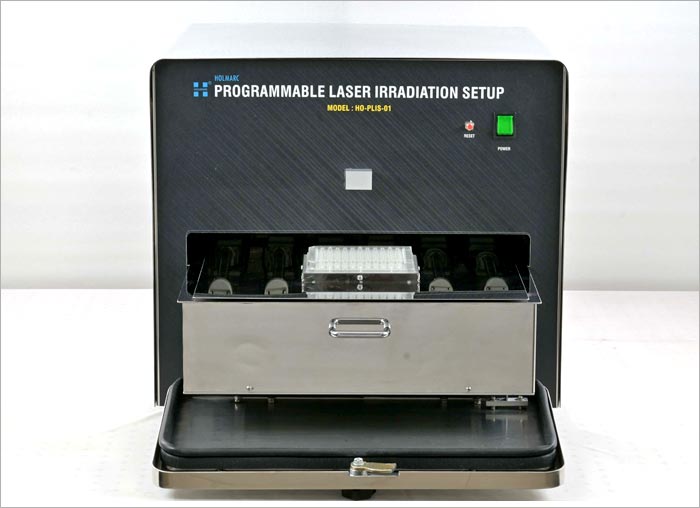 Holmarc’s Programmable Triple Channel Laser Irradiation System is a precision-engineered platform designed for advanced research in photobiology, photochemistry, optogenetics, and related light-based experimental studies. The system consists of three integrated laser channels operating at 665 nm, 785 nm, and 850 nm, each fully programmable and independently controllable via a PC interface. It delivers uniform, collimated laser exposure across standard 96-well cell culture plates, enabling highly reproducible and quantitative irradiation for in-vitro studies. The platform supports precise control over laser power, wavelength, frequency, exposure time, delay, and custom irradiation sequences, allowing researchers to perform complex multi-wavelength experiments with repeatable accuracy. Enclosed within a rigid, light-tight housing, the system ensures safe operation in laboratory environments while maintaining ease of access for sample handling and experimental setup. This versatile setup is ideal for phototherapy studies, drug–light interaction experiments, optogenetic stimulation, photobiomodulation research, and photochemical reaction analysis.