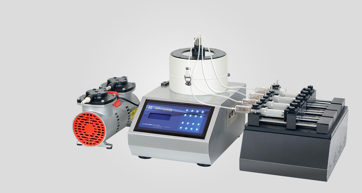 Holmarc’s Spin Coating Unit with Integrated Syringe Pump, Model no: HO-TH-05TS4 is a dedicated tabletop system to spin coat small substrates in research laboratories with well controlled spin process parameters. The high speed and duration range allows the user to achieve the desired thickness or thinness of the film. The spin head actuator is a precision DC servo motor, which requires less maintenance, with accurate speed and acceleration control. A vacuum chuck powered by oil-less vacuum pump holds the substrate at the spinning head. HO-TH-05TS4 has an independently controlled four channel syringe pump to disppense to the substrate automatically at the start of, or during, the spinning process. The pump is connected to the spinning bowl through Silicon tubing.